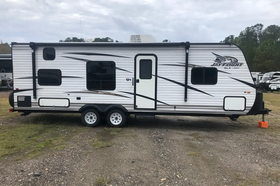 See below for delivery prices. $10 off per night for repeat renters. Refer a friend and I'll give you $25!! The Jayco Jay Flight bunkhouse is easily towable with pretty much any truck, full size SUV's and some mid-sized SUV's. 29'5", only 4700 pounds with electric brakes. 7 point wiring harness with brake controller required. I supply a multi position drawbar with anti-sway to get your tow height squared away. No weight distribution needed. Very easy to tow. Very stable. 16 foot power awning. Power front hitch. RV Queen bed up front with curtain, with very comfortable mattress. Rear double bunk over double bunk. Dinette makes into a bed and the jackknife sofa does as well. Sleeps 8 with ease, 10 if you have small children. 3 inch foam toppers on both of the bunks. Fully stocked. Sheets, pillows, blankets, towels, everything included. 15K Ducted air with digital thermostat. Electric/gas refrigerator. Easy to use Day/Night shades. TV with DVD player in the living. Inside and outside speakers with aux input. Lots of storage throughout. All you need to bring is food, clothes and toiletries.