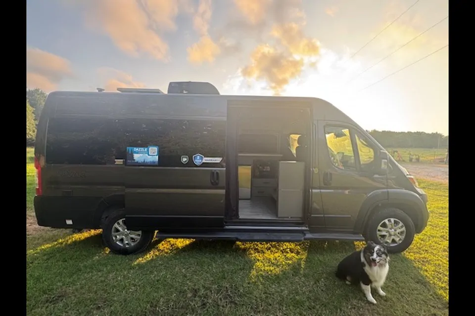 A new 2024 Thor Dazzle 2LB that is perfect for couples to explore the U.S. or a weekend away. It has a small bath with a toilet, shower, and sink. It also has a small kitchenette with a sink, stove, fridge, and microwave. All these amenities are on a RAM ProMaster chassis with a V6 engine.
