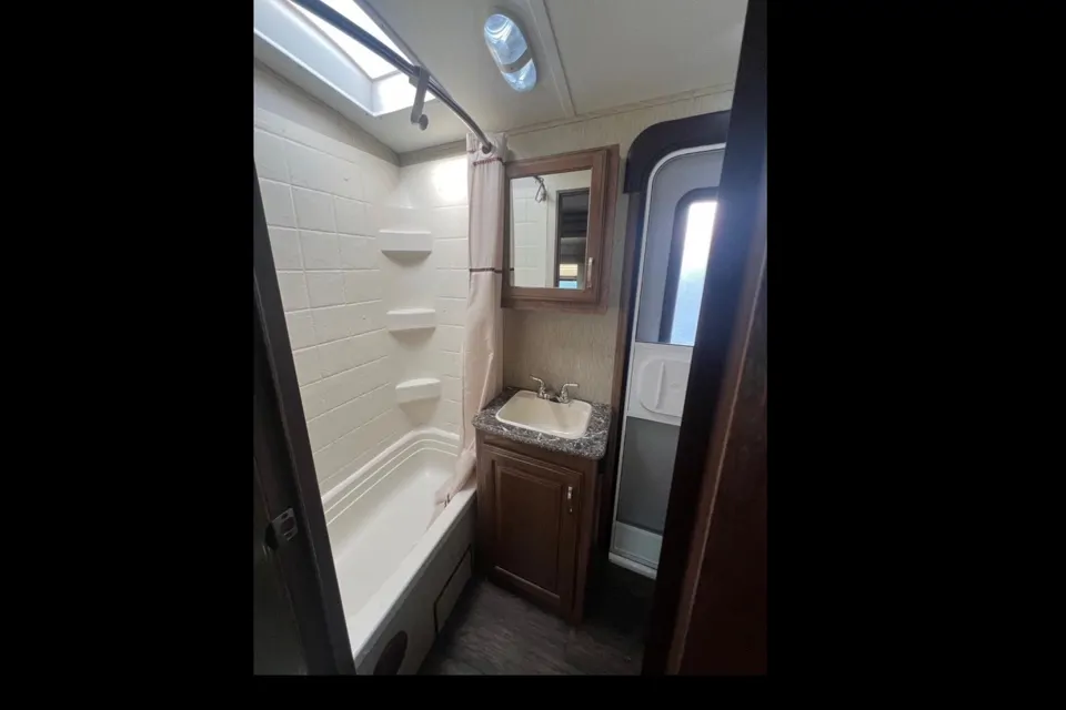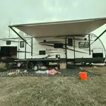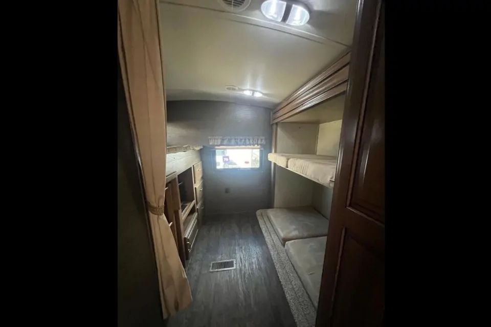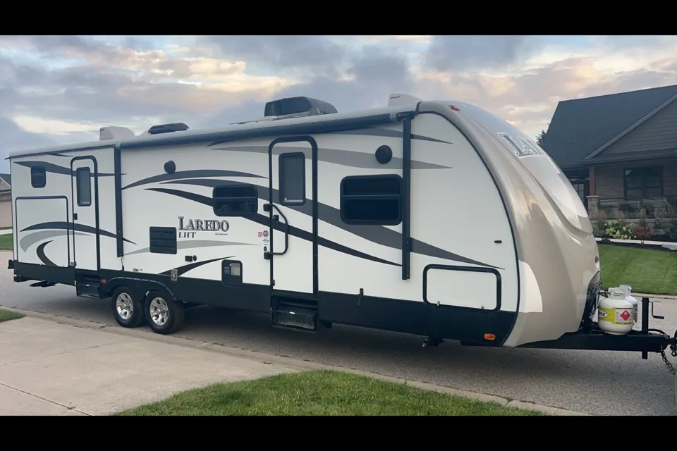 35’ travel trailer, queen bed in the front, pull out sofa and dinette bed, bunk in the rear along with one bed above the out door kitchen. Power awning along with strip lighting long the awning and trailer. 2 slides, good for big families
