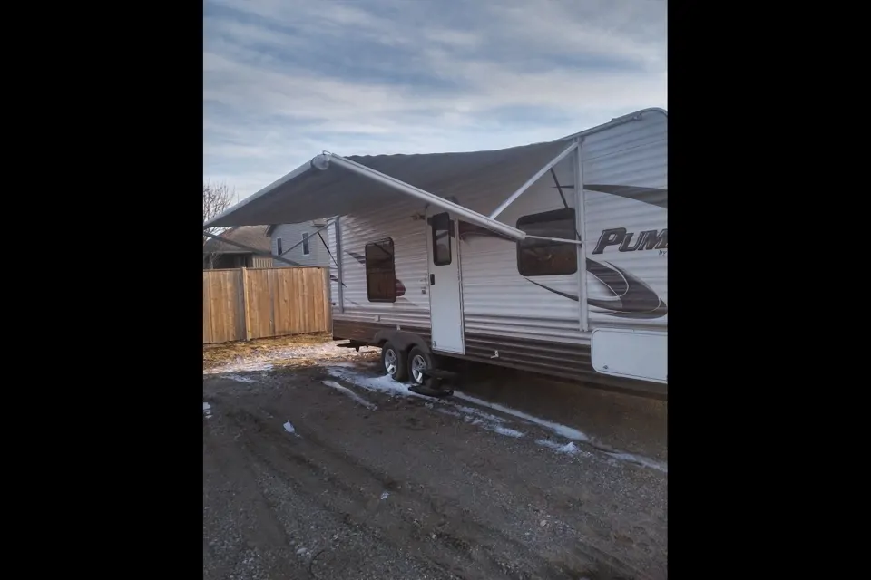 23 foot travel trailer that will sleep up to 6 with a queen bed in the front, fold down dinette and a fold out sofa