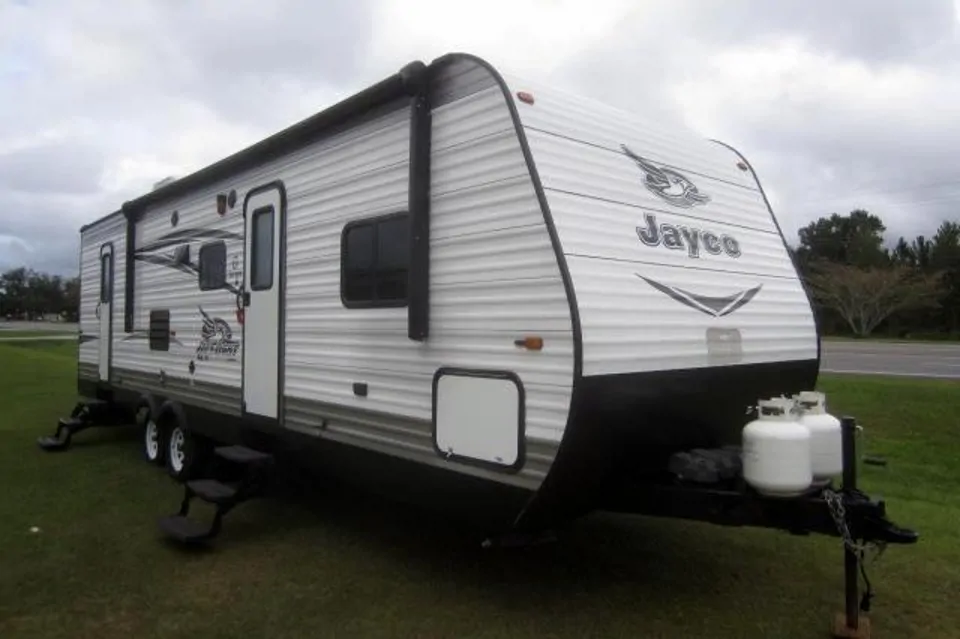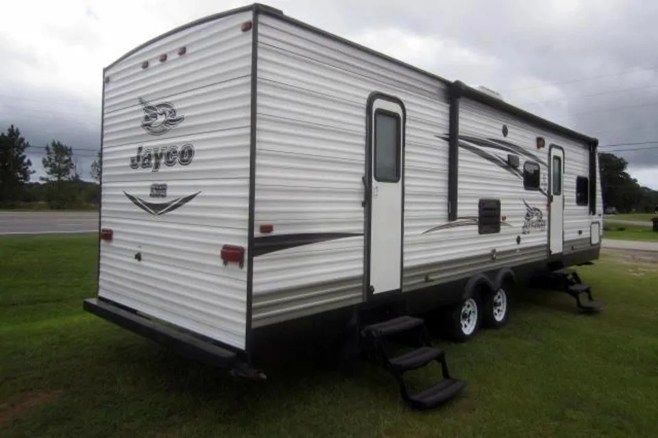 Queen bed in the front, fold down dinette, fold out sofa and 2 double bunks