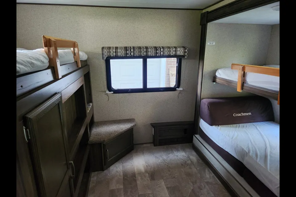 The separate bunkhouse at the back of the trailer is the most amazing space for your children. It has 3 beds and a pull-out mattress for the floor. The space is great for a rainy day and even better, a peaceful night's sleep for everyone! The large slide-out makes it feel extra spacious.