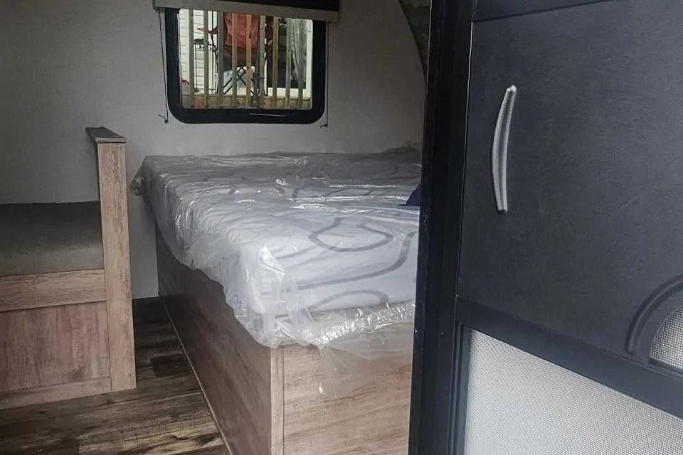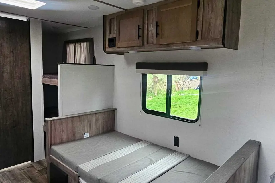Brand new, comfy and cozy with bunk beds for the kids and dinette folds into bed. Beautiful and clean kitchen and bathroom. Stove, fridge and microwave. Lots of storage. Great way to spend your summer camping, 21 feet! We call it The Burger.