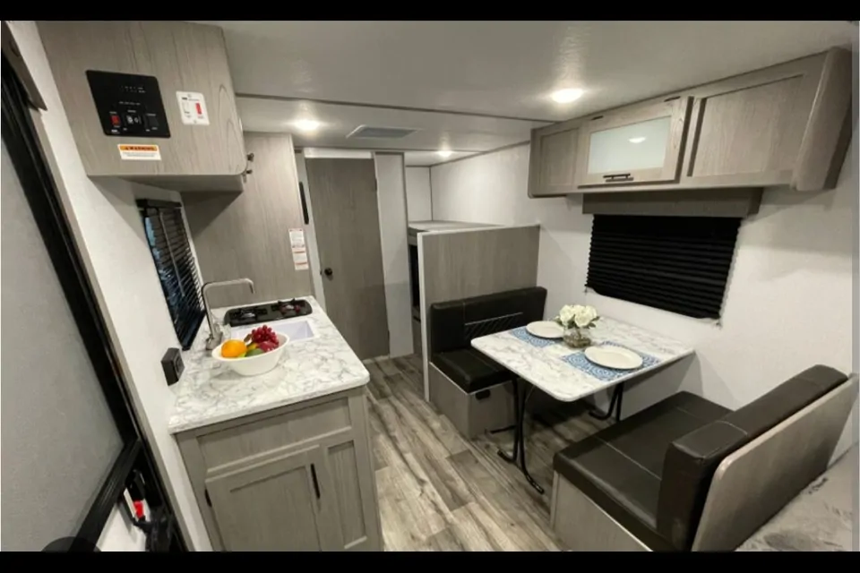 Clean efficient cozy 17' travel trailer. Easily pulled by a suv or bigger vehicle. Whether you are looking to relax or go on adventures the layout of space is ideal. Rv is equipped with electric kettle, bbq utensil, 4 plates, 4 bowls and silverware. Complimentary soap, shampoo, conditioner, tea and instant coffee. Toiletries and towels will be supplied. We do have add-ons if you wish to check them out for an additional fee. This is a non smoking unit..
