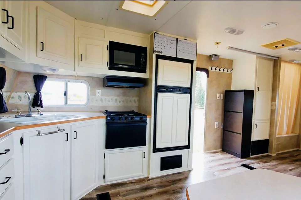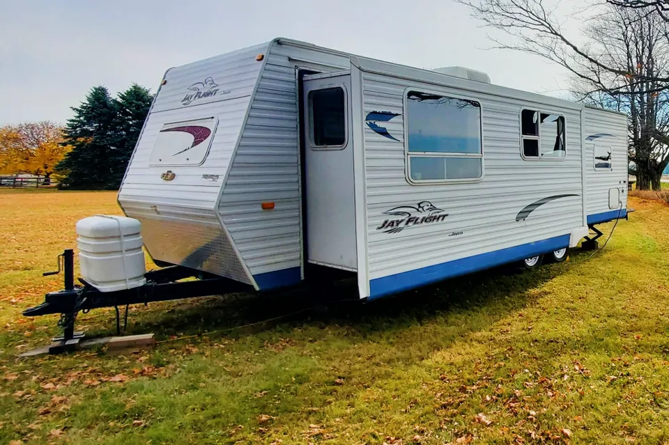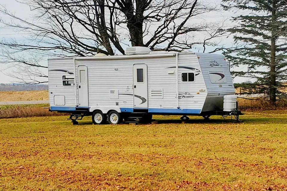 Beautifully renovated Jayco Jayflight 28FKS. Ample white cabinetry in kitchen, master bedroom and washroom with new 12mm handscraped luxury flooring laid throughout. Queen sized bed in master with washroom door opening up to become divider between master bedroom and front. New sectional couch folds out into a second bed with storage under the chaise. All windows covered with custom made privacy curtains.