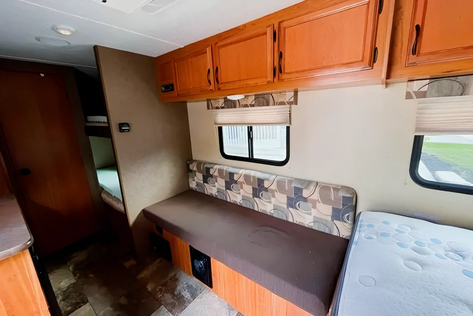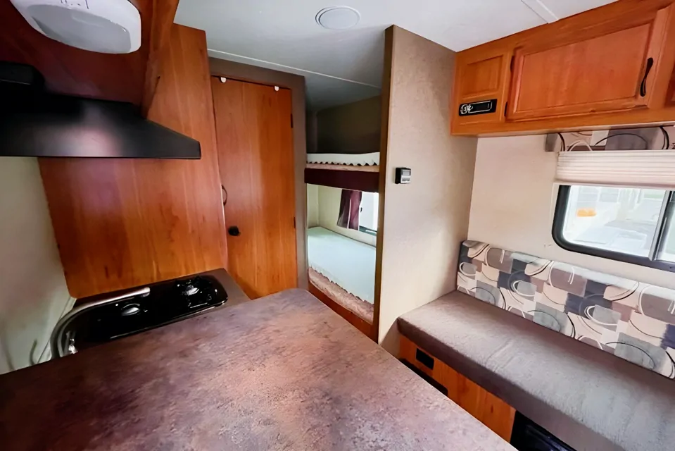 This little camper is perfect for a family up to four! There is one small bench/sofa bed which works for a small child (family up to five). It has everything you need for a trip away (solar panel, camping chairs, BBQ, propane stove, cooking utensils, plates, cups, mugs, cutlery, fan and everything is CLEAN! Just pack your clothes and bedding! It is lightweight and towable with a SUV or minivan. At only 18', your campsite options are endless and this one is easy to park. Connect to services or camp off-grid - set up in minutes.