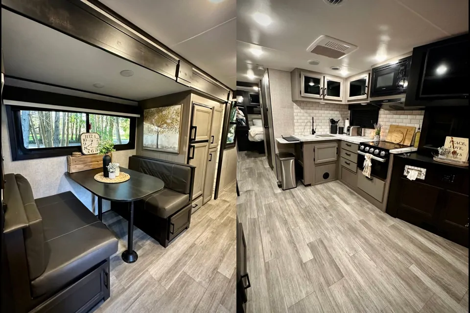 Inside, you’ll find a spacious rear living area with a comfortable pull out couch, a convertible dinette, and lots of windows for natural light and scenic views. Whether you’re lounging during the day or needing extra sleeping space at night, the pull-out couch is perfect for guests or kids. The kitchen comes ready to go with a fridge, freezer, stove, oven, microwave, and kitchenware included — everything you need to whip up meals while you camp!
