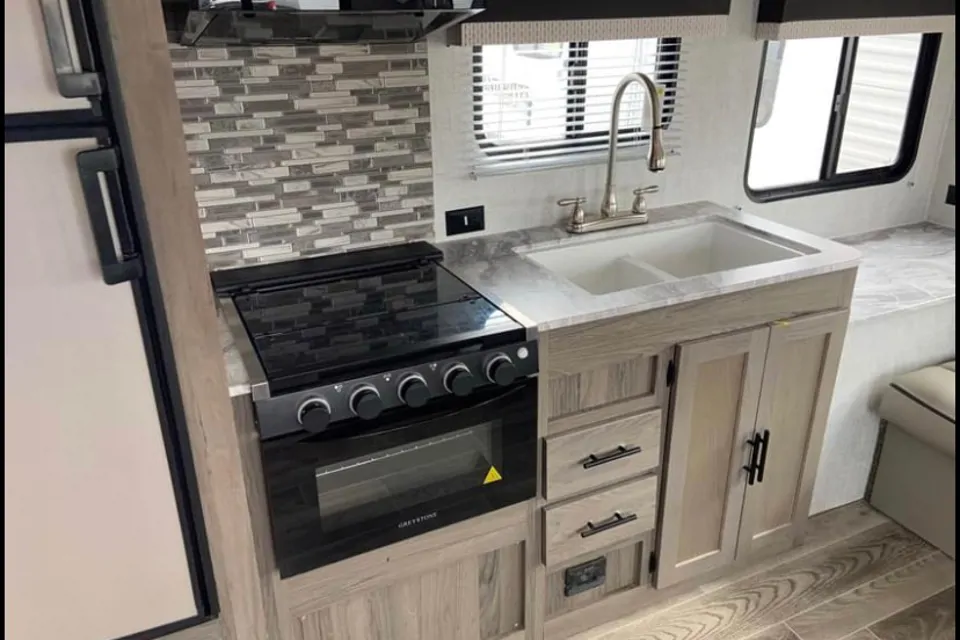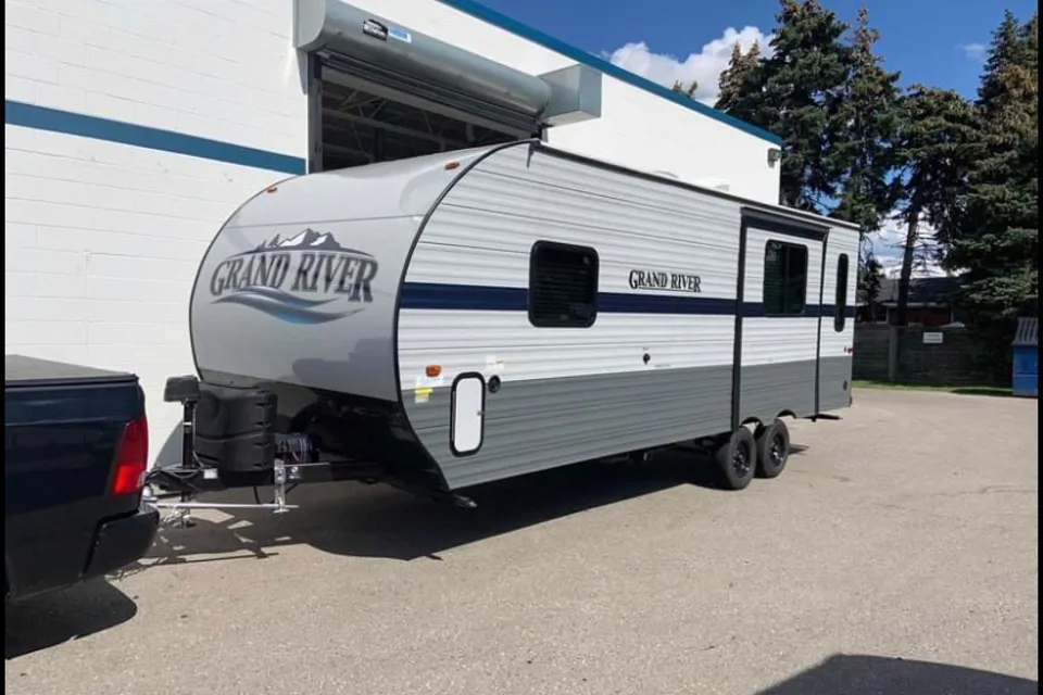 This trailer is designed for a couple or a small family with small children. Trailer is brand new and has everything ready to go. We love that the bedroom is separate from the rest of the trailer and bathroom is joined to bedroom. This size trailer is easy to tow and easy to park on site.