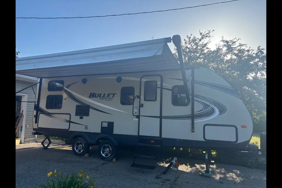 2017 keystone bullet 243 bhs. It has a queen size bed at the front. Double bunk beds at the back. A large dinning area that can be converted to a bed a 32 inch tv with a cool stereo with indoor and outdoors speakers. A bathroom with a stand up shower and a small bath for little kids outdoor kitchen with small outside fridge an outdoor shower and Tons of storage underneath.