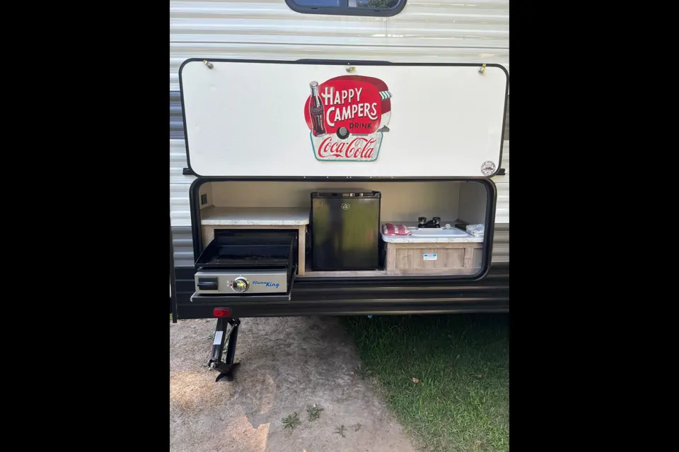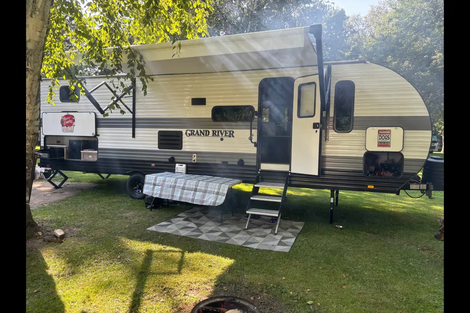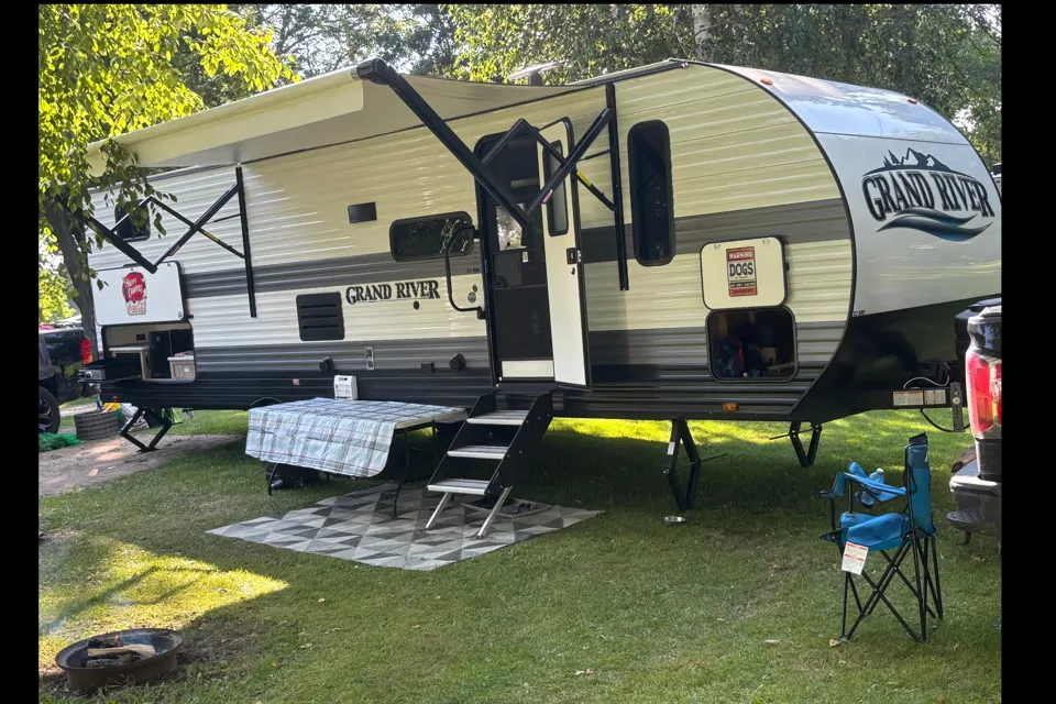 Hi, welcome to the Strong’s trailer . We have room to sleep up to 9 people. It comes with 3 TVs, indoor/outdoor stereo, awning with led lights. Outdoor kitchen. Table to set up outside, 3 camping chairs for adults and 3 camping chairs for kids. We have 2 solid steel rope leads to tie your fur babies up too. Full kitchen with oven, with pots and pans. We have a bean bag toss and some board games aswell as card games.