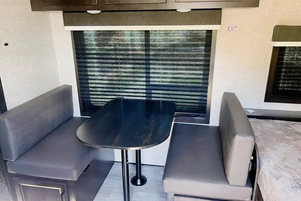 The trailer also comes equipped with a fully functional kitchen, complete with a refrigerator, stove, and microwave, so you can whip up delicious meals while on the road. And when you're ready to relax, there's a cozy seating area perfect for playing board games, watching movies, or just enjoying each other's company.