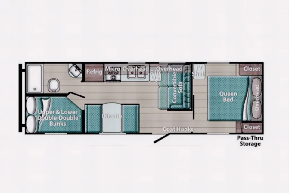 The 26BHG has a private bedroom with a queen-size bed, overhead cabinets, and a wardrobe on either side of the bed. The bathroom includes a toilet, a sink with a medicine cabinet, and a shower with a skylight. Sleep 6 comfortably.