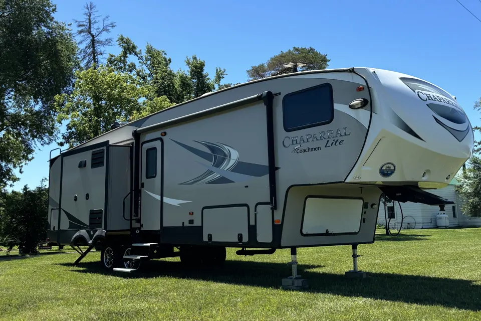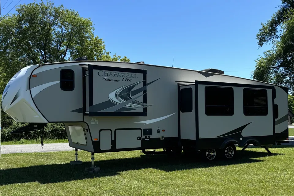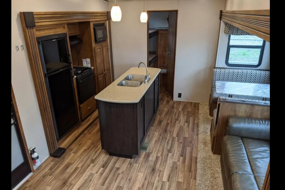 This RV has been very lightly used and well kept. It is ready for you to make lasting memories with your loved ones. This beautiful trailer boasts 4 single bunk beds, a queen size bed, inviting entertainment area with an electric fireplace and a 50” inch flat screen. Sit at the island and enjoy or a drink or outside while cooking at the outdoor kitchen.