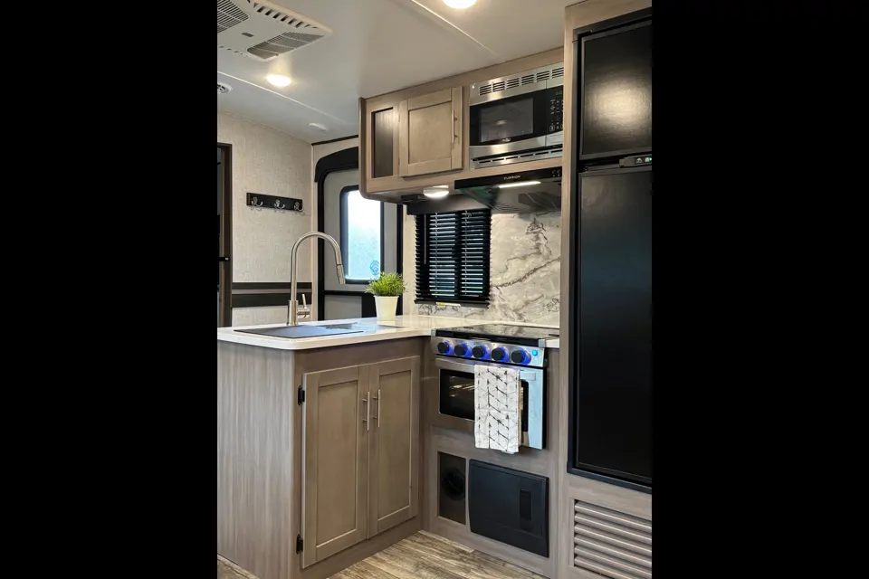 Outdoor kitchen includes fridge and griddle, separate entrance to bathroom, tons of storage compartments!