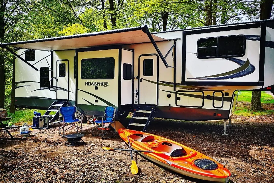 Experience the great outdoors with the luxury you deserve! Our fifth wheel trailer, available at Coonhound RV Rentals, comfortably accommodates 6-8 people. It features a convenient private bedroom with a king-size bed, a separate upstairs loft with two single beds, and two flip-out couches in the living room.