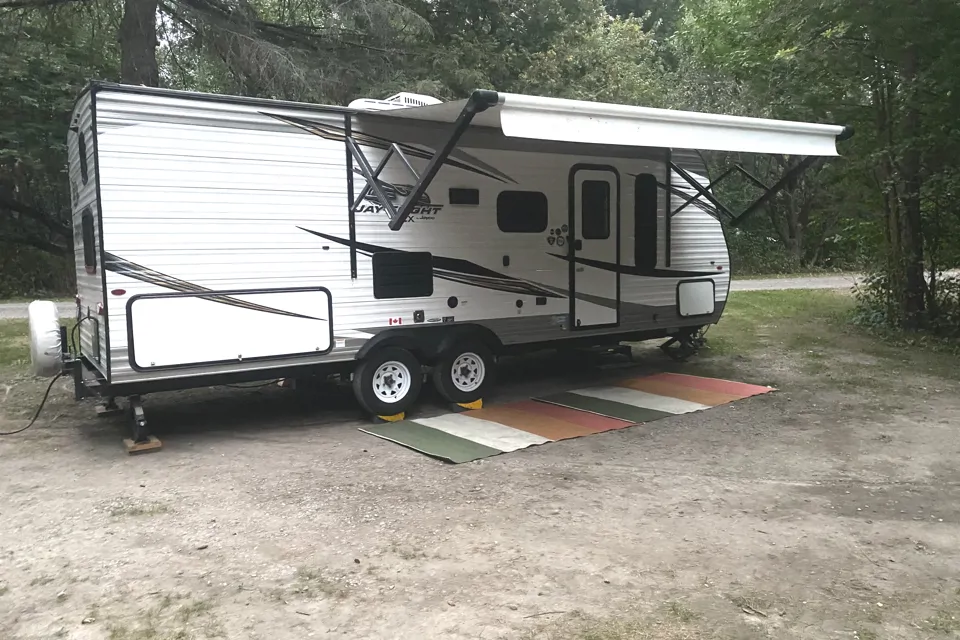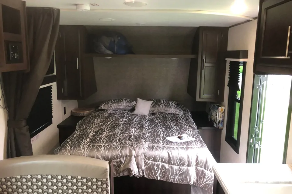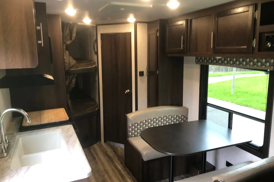 Family friendly and cozy trailer that creates lifetime memories! Queen bed, with Double wide bunk beds and dinnette table that turns into an additional bed. This trailer has everything you need to enjoy a fun filled weekend.