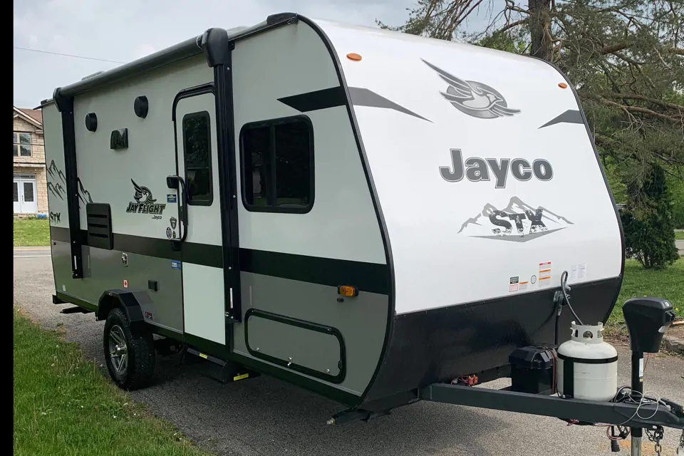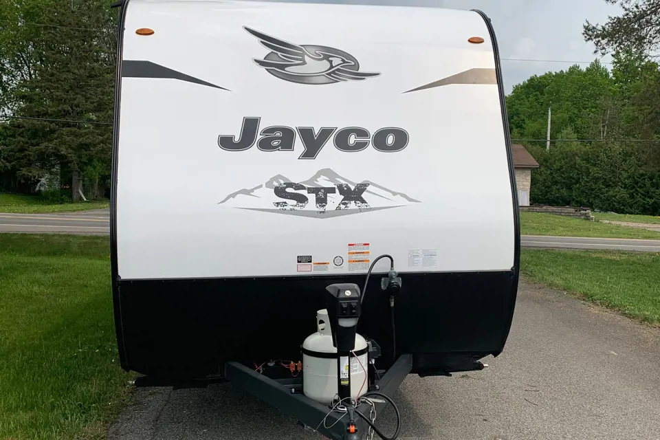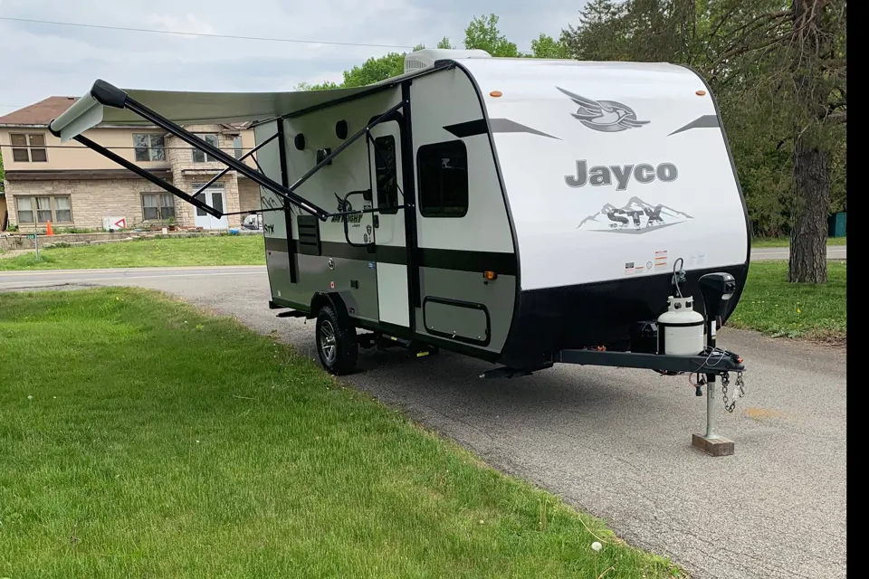 The family-friendly 2022 Jayco 174bh SLX 7 STX Offroad package with solar. This travel trailer is lightweight and comes in dry at 3400 lbs. The offroad package includes higher ride height and larger all-terrain tires for greater access. As well as larger tanks for more capacity. The trailer is the perfect size for many SUVs, mini-van, and trucks to pull as long as you have a 2" hitch ball and a 7-pin trailer harness plus a brake controller. This trailer is perfect for couples and families alike with the queen size bed and double bunk beds it also has a folding table bed for little ones. It is equipped with solar for off-grid camping as well as all the fitting for your campsite hookups. There is a large fridge and freezer. All the appliances aside from the microwave can be powered by propane if needed.(propane tank 30lb) There is AC that blows cold tinted windows for privacy and heat reduction to keep the trailer cooler on hotter days. It has a power awning and exterior/ interior sound system for lounging and creating shade from the sun.