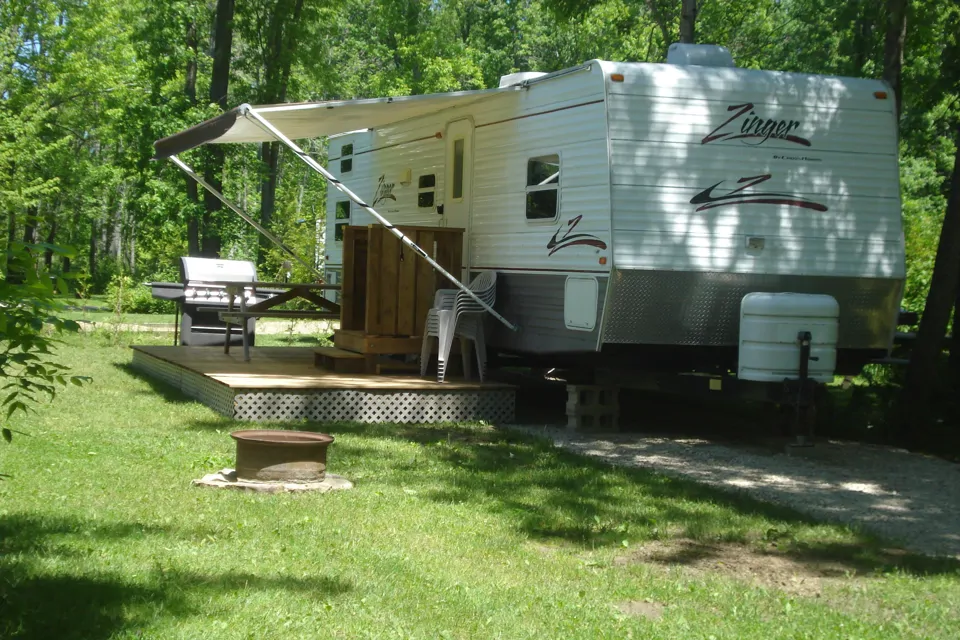 This unit is equipped with everything you need except your bedding and towels. A full list of equipment provided can be found on our website windingrivercampground.com Trailer is set up on the site and ready for you to use. Enjoy our campground’s amenities at no extra cost (fishing, volleyball, badminton, horseshoes, playground and of course the pool). Bring your Kayak or Canoe to Paddle the river!