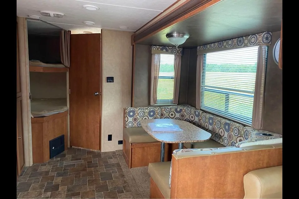 Trailer has a Queen bedroom, Rear bunks, Large slide-out with sofa and dinette.