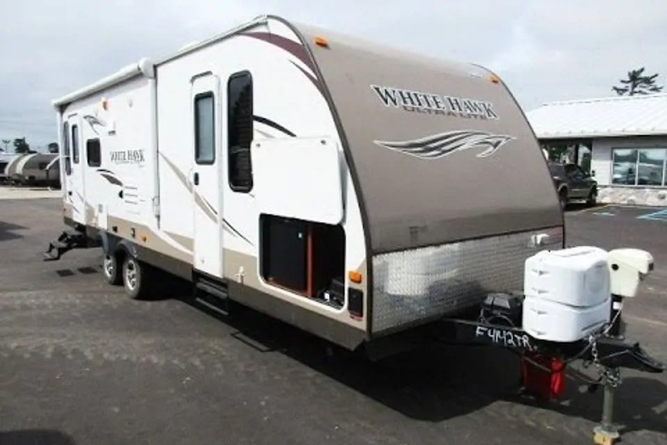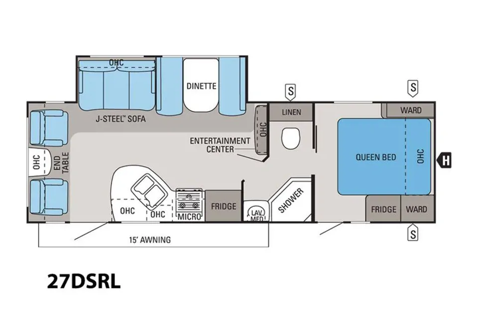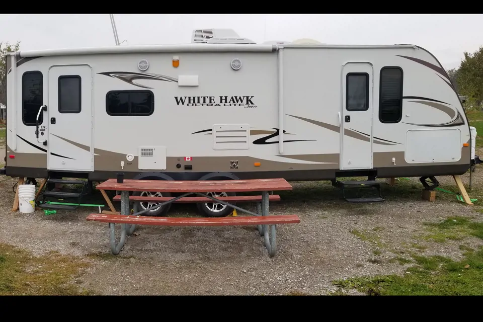 Very clean, Never Smoked in (No Smoking Please). Great layout for family or couples! Rear Living setup with huge windows and seating for 8 for rainy days. Living rm Tv and Bdrm Tv. 2nd minifridge in front outside storage compartment ideal for Drinks. Power awning. Lots of cupboards for storage of clothes, food, etc. Large fridge with freezer. Coffee Maker (Kuerig), Toaster, Full Size Outdoor BBQ. Pots, Pans, and dishware provided. Please bring your own linens and pillows.