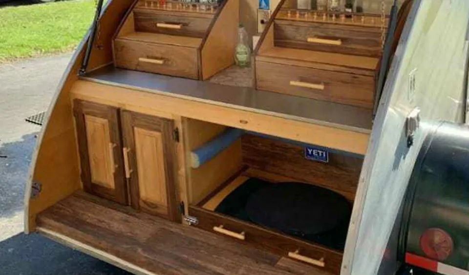 Kitchen storage cabinetry includes slide out cooler shelf that fits a Yeti 45 (optional), and a folding table that clips to the side of the camper to give loads of counter space.