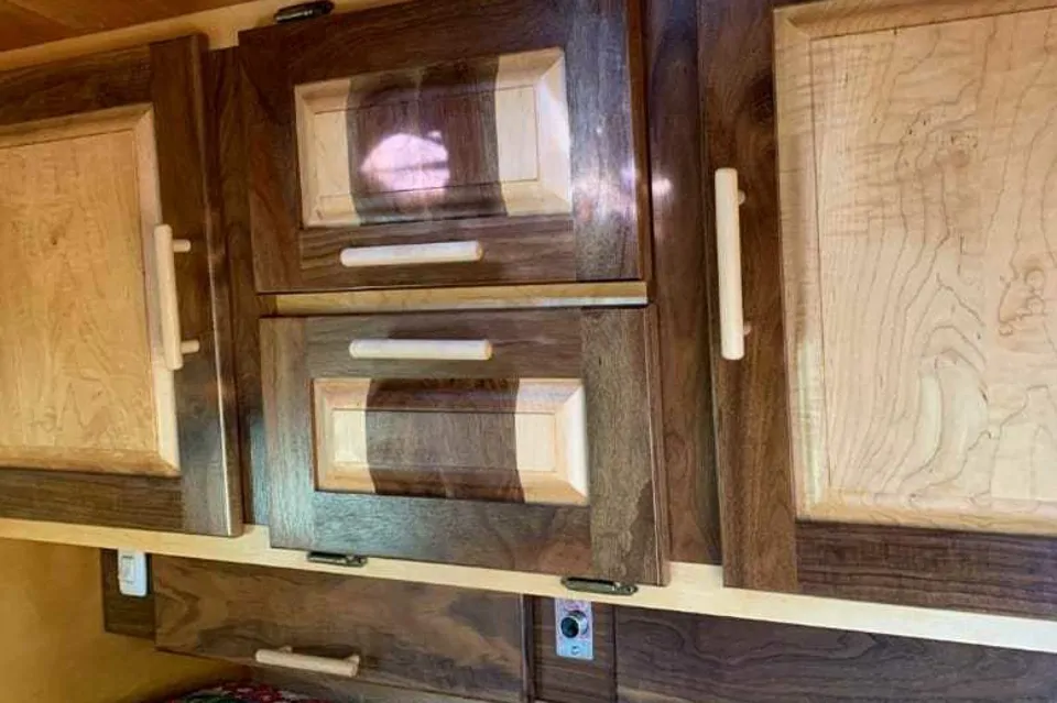 This is a hand built custom designed replica of the classic California Kenskill Company camper. Mod Cons and special features include Bose sound system, Mag wheels for easy towing even on unpaved roads, solid maple and walnut cabinetry and interior finishes, ample indoor and out lighting, clothes hooks, storage cabinets, reading lights, fully automatic roof vent fan, luxury full size mattress, two entry doors. Authentic retro pattern curtains, quilt and pillow shams available to complete the look.
