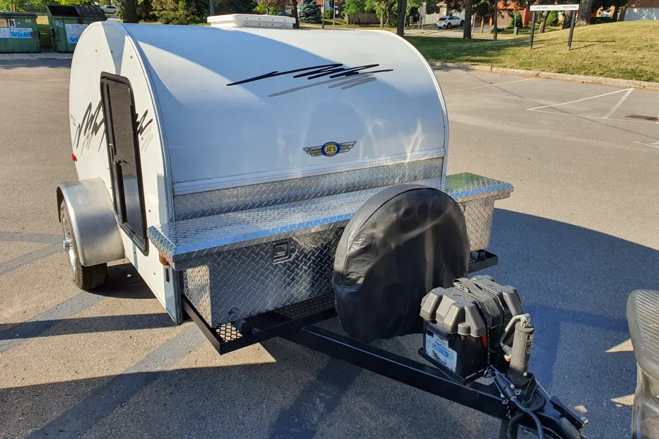 Lightweight Tear Drop Trailer that any car can tow easily, has roof fan and sliding window on each side for good air circulation especially for warm summer nights. Extra lockable diamond plate storage at front of trailer and rear has table top to store more goods or prepare food. 12V battery power for lights, fan and to charge your electronics. Brand new tires and full spare, queen size bed and privacy blinds for the windows. Inside cupboards as well for more storage. Dont hesitate to ask any questions.