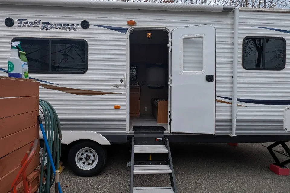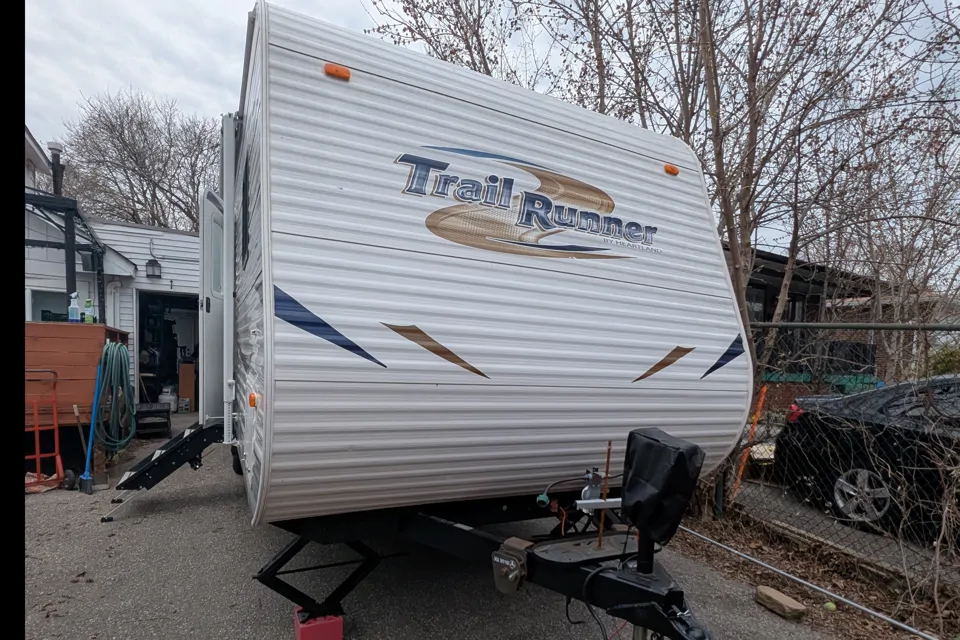 This is our trailer. Great, comfortable and practical. Yes it does needs some updating but that's why it's on here to help fund that. Love the fact we put the solid step in it! The RV brought us from Alberta to Ontario and to be honest we had some issues but overall it was an amazing and comfortable trip. More to come hopefully. We do require all the tanks to be emptied before returning the RV, especially the black and grey tanks. If you do not know how to please ask me. We also do require the RV to be treated with respect no smoking of any kind inside the RV and to be returned cleaned or extra charges will be applied. We also have a weight distribution hitch to go with the trailer to make it safer for travel. Vehicle's that are towing the trailer must have their own brake controller! The radio unfortunately is broken I am looking for a better option so we do apologize for that bring your own Bluetooth speakers.