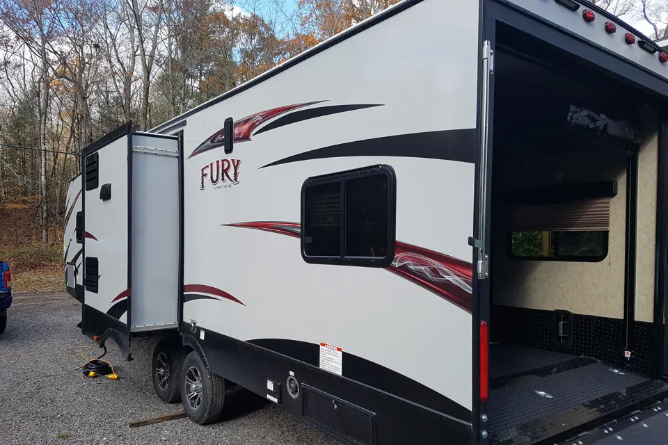 Lightweight 2018 toy hauler with 2 slide outs and separate garage that turns into 2nd private room, and dining room.
