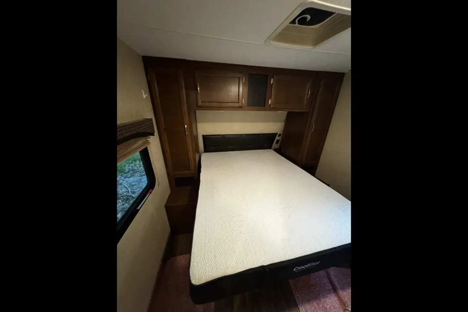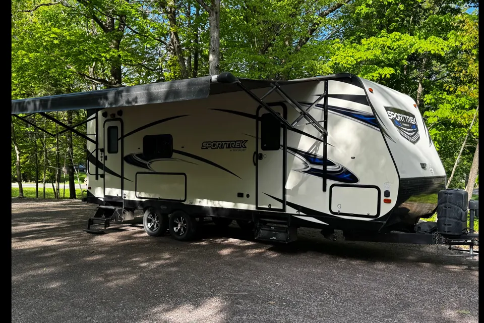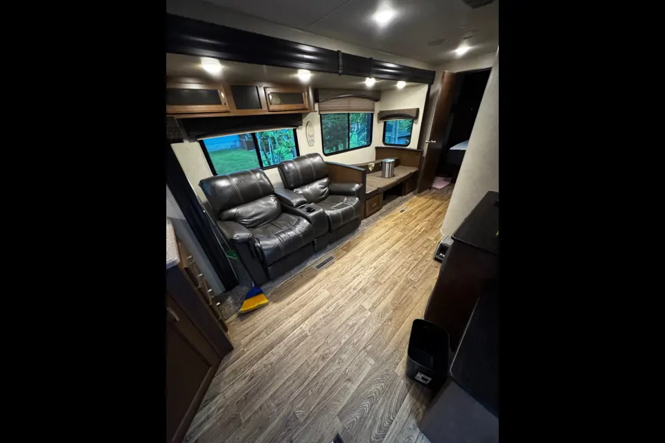 Great camper for a couple or family young children, it has a cozy fireplace, 2 smart tv’s, queen size bed as well as a drop down bed for the little ones. It has a great outdoor kitchen as well as a huge awning, good size bathroom with a large stand up shower. Small furry friends are welcome