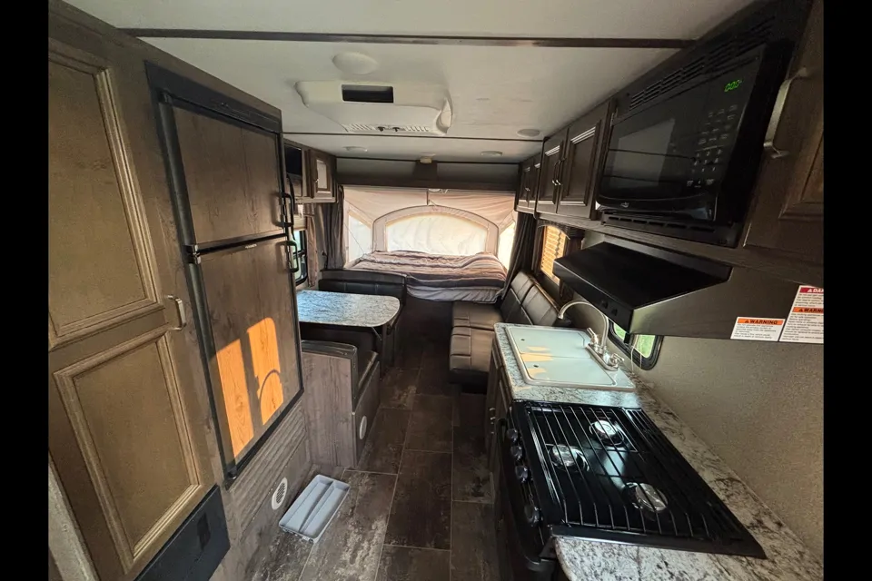 Get the open, breezy feel of tent camping with the comfort of a full trailer. The fold-out queen beds expand your living space without adding to your towing length—great for families or couples wanting extra room.