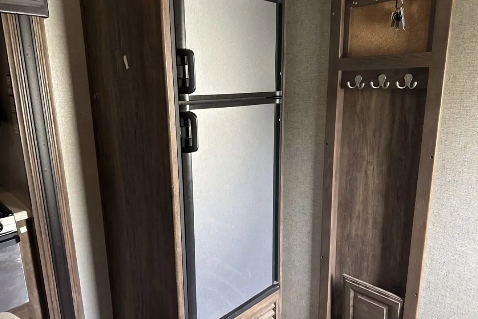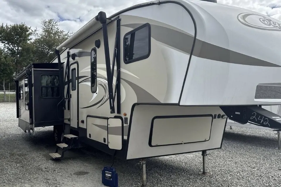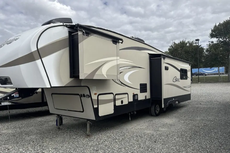 Remarkable fifth-wheel RV that perfectly blends comfort and style. This unit is ready for your next adventure. Inside, you'll find a spacious living area featuring cozy theater seating and a modern kitchen equipped with stainless steel appliances, perfect for whipping up your favorite meals. The master bedroom boasts a luxurious queen bed, ensuring restful nights on the road. Key highlights include ample storage, a stunning outdoor awning for relaxation, and large panoramic windows that invite natural light. Experience the open road like never before in this exceptional Keystone Cougar 29RES.