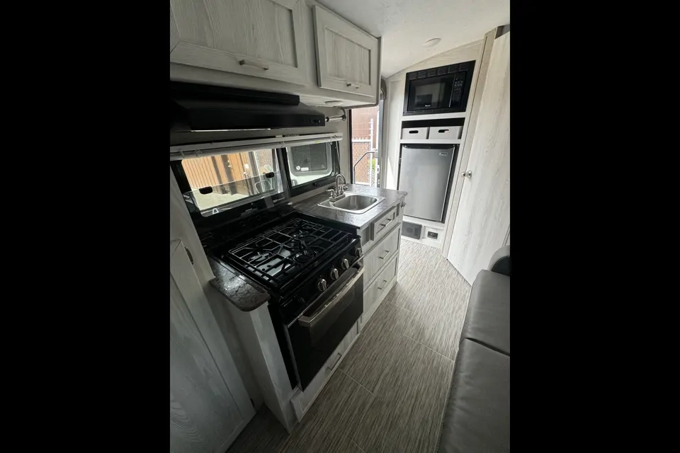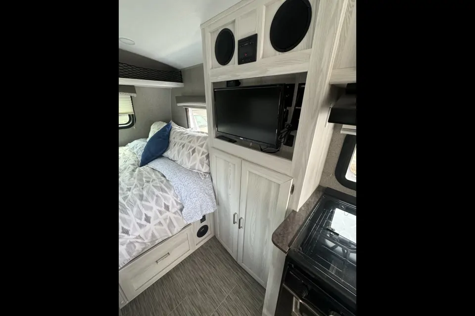 She has a full oven, stove, sink, and microwave. Plenty of storage for clothes with a closet under the tv. There is also a lovely sound system for watching shows or playing music.