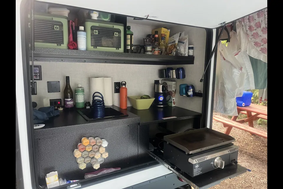 Perfect for single traveler, a couple, or pack tents for the kids and bring the whole family (we camp with three teenagers!) We are requesting no pets sleep inside the trailer. Our brand new square drop trailer is ready for off grid adventures with 400W of solar, 26 gallon fresh water tank, outdoor shower, and more storage than you’d expect from a small trailer. The mattress is 80” long, comfortably sleeps two adults (we are both over 6’ tall), or can fold in half for a super thick mattress for one. GVWR is only 3450lbs! We have a weight distribution hitch if you are pulling with a smaller vehicle. It does have a receiver on the back to add a bike rack and a roof rack for extra storage, kayak etc. This trailer does not have a fridge but does have 12V outlets if you have a plug in cooler. Also does not have a toilet. A true outdoor experience - but with a comfy bed. We love it - we are sure you will too! Will not rent for burning man but other festivals or events would be considered. Absolutely no smoking inside the trailer or near it with doors open. We expect propane tanks to be returned full or use the prepaid add on. Water tank would be full with filtered water on pickup.