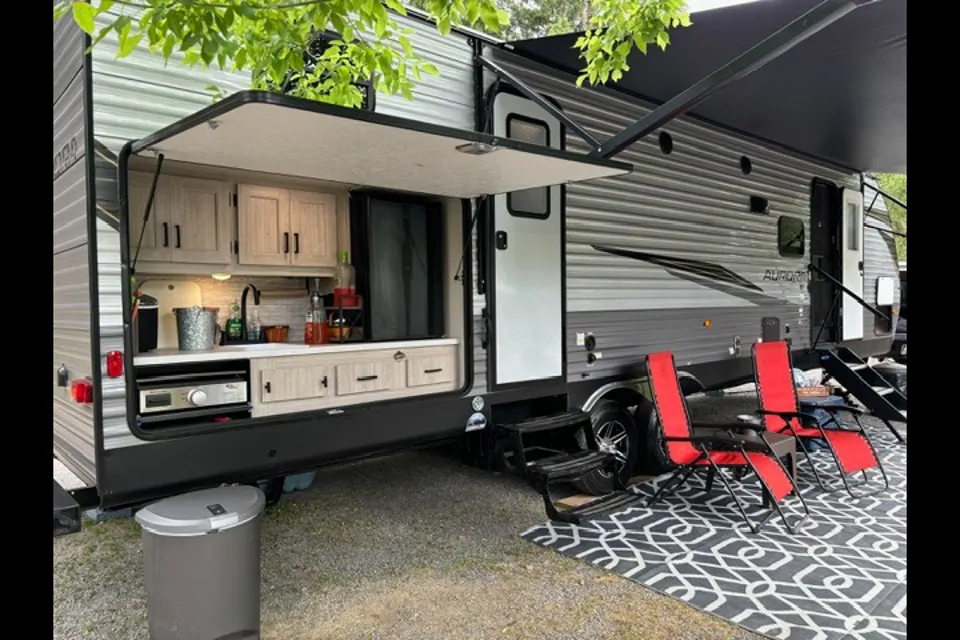 Tons of room for family fun! Great private Bunk House at the rear of the Camper. Large bunk house slide out provides all sorts of space. A nice, private Master Bedroom at the front of the camper to separate from the noise! The interior Kitchen is well appointed with lots of storage. The Large Outside Kitchen is extremely useful with a larger fridge, counter space, cabinets, sink and grill. This unit boasts a 21ft Electric Awning to help keep your essentials dry. Great LED awning lights keep it well lit at night. The bathroom has its own exterior entrance! This feature avoids everyone tracking the outside stuff through the camper when need to use the facilities. Bathroom is very roomy and well appointed. There are 20+ Hooks to hand those hoodies, sweathshirts and jackets! Complete with key rack so they dont get lost. This camper layout is a family favorite, Mom will love the interior, Dad will love the outdoor kitchen! Full camper operations work through the onboard panel, or simply download a free phone App and control the camper by your phone! You can can see your holding tank levels, turn on and off interior and exterior lights all through your phone. Fire place and large screen TV round out the features.