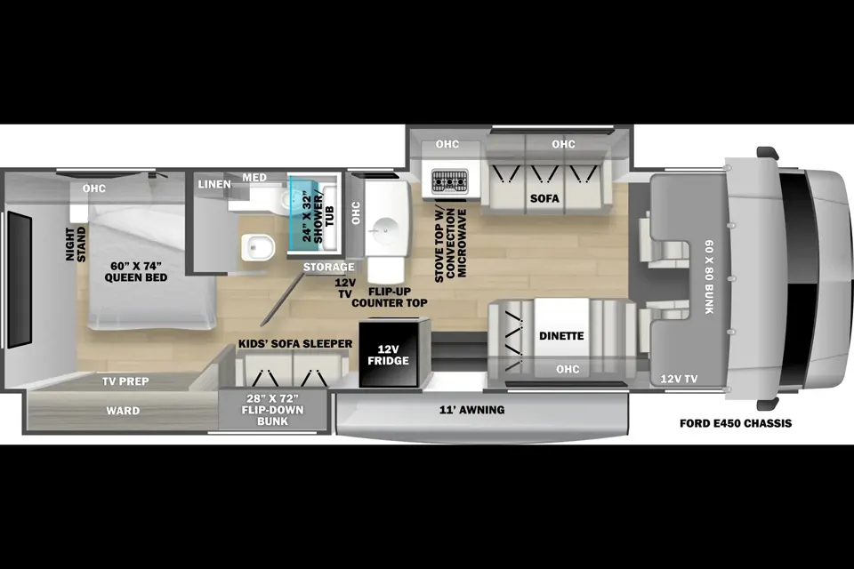 The Forester 3251SLE has a dedicated Kid Zone (fold down bunk, sofa sleeper, and entertainment center), private rear queen bedroom, and bunk over cab. The kitchen offers a convection microwave and recessed three-burner range. The refrigerator has plenty of room, and the U-shaped dinette is perfect for family dining. The bathroom has a 24" x 32" skylight shower, commode, sink, and medicine cabinet, plus storage cabinets just outside the door. This model is built on a Ford E450 chassis.