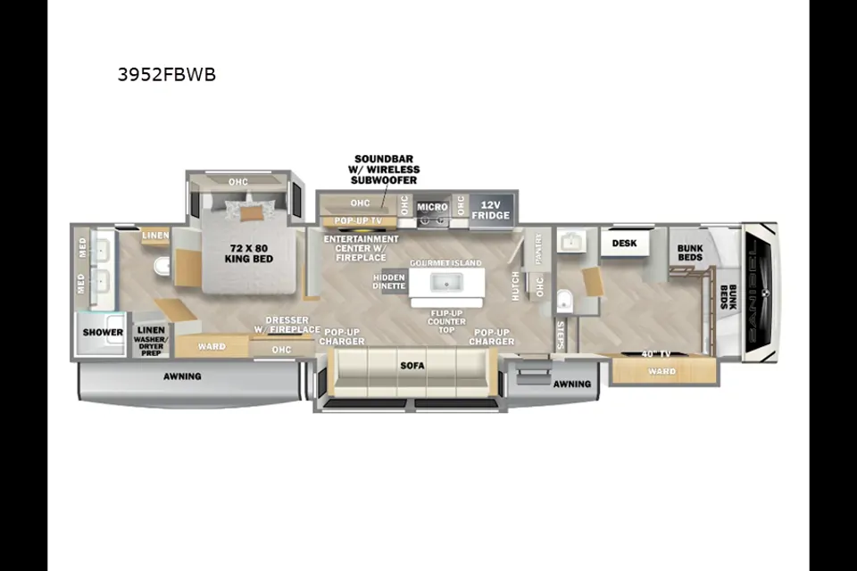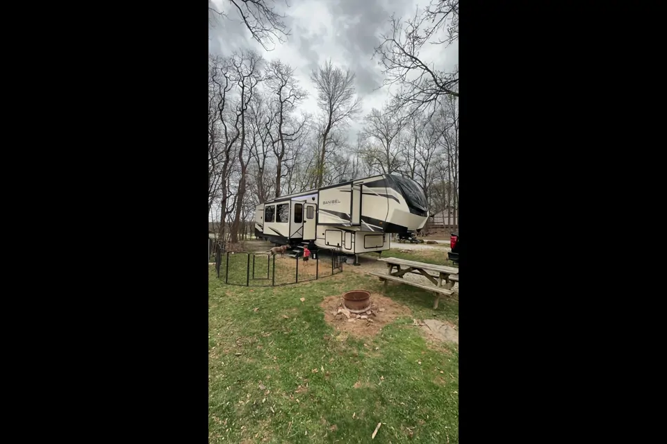 Cozy 5th wheel with a real at home feel. Front bunk room with 4 bunks, a desk, TV and half bath. Kitchen/living area with couch and tv. Master with an RV King bed and full bathroom with shower and double sinks. Feel at home while away from home!