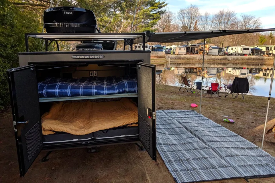 Tiroir cuisine extérieur comprenant une glacière électrique (120V/12V), une cuisinière à deux ronds au propane (propane inclus) et tout le nécessaire de cuisine (vaisselle, petit chaudron, poêle, passoire, ustensiles etc). La glacière est pratiquement autonome, grâce aux panneaux solaires de 200 watts.