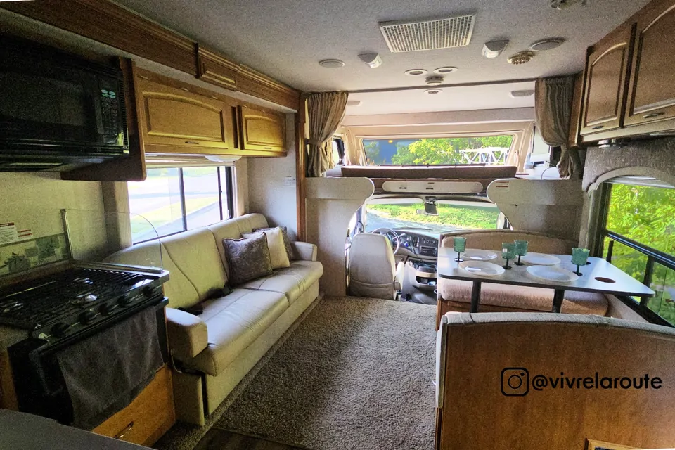 Aménagé avec soin, notre VR Rosa dispose d’une chambre principale fermée à l’arrière avec un lit queen. L’extension de 6 pieds dans le salon offre un bel espace de vie avec un canapé trois places convertible en lit double, une table à manger transformable en lit simple, ainsi qu’un lit double supplémentaire au-dessus de la cabine. Rosa est également équipée de nombreux rangements, d’une cuisinière à trois feux au propane, d’un réfrigérateur-congélateur, d’une salle de bain avec douche vitrée, d’un four, d’un micro-ondes de taille résidentielle, d’un évier double dans la cuisine, d’un chauffe-eau, d’un climatiseur électrique au plafond, d’un chauffage central au propane, ainsi que de quelques jeux de société pour bien commencer le voyage. L’auvent extérieur est un vrai plus, quel que soit le temps.
