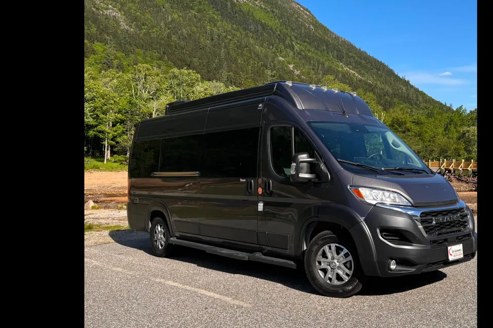 RAM Promaster Thor pop top Classe B 21 pieds à essence. Tout équipé avec salle de bain intérieur complète et douche extérieur arrière, réfrigérateur, cuisinière à 2 brûleurs, micro-onde, très grand lit confortable et lit double pop top. Système de ventilation, chauffage et climatisation, panneau solaire 200 watts et génératrice pour recharger les batteries au lithium. Système radio AM/FM avec haut-parleurs et Car play intégré. Grandes fenêtres latérales ouvrantes avec stores de nuit opaques, moustiquaires arrière et latéral.