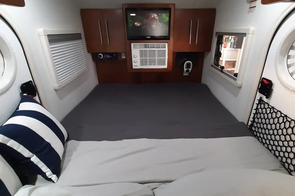 Cette micro-roulotte légère (1000 lbs) vous permet de ne pas être limité dans les choix de vos sites en nature tout en vous procurant confort, sécurité et rapidité d’installation. Cette roulotte requiert un véhicule ayant la capacité de remorquer 1000 -1500 lbs.