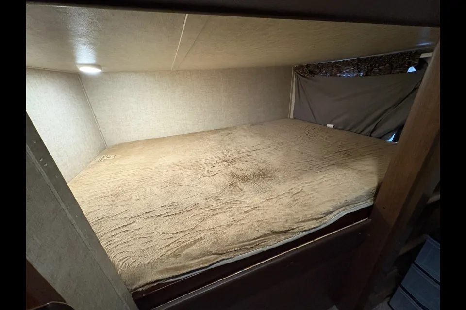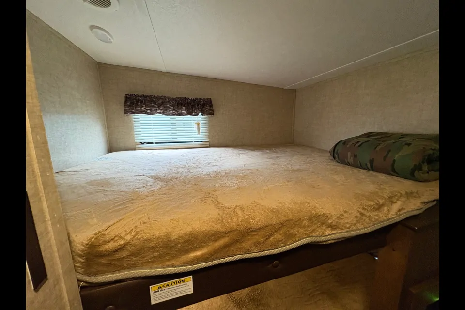 Fifthwheel de 35’ avec deux chambres fermé. Cuisine extérieur. Divan lit double, table de cuisine ce transforme en lit simple. Vaisselles, coupes, ustensiles inclus. Fifthwheel NON fumeurs. Chaises de camping inclus dans le rangement.