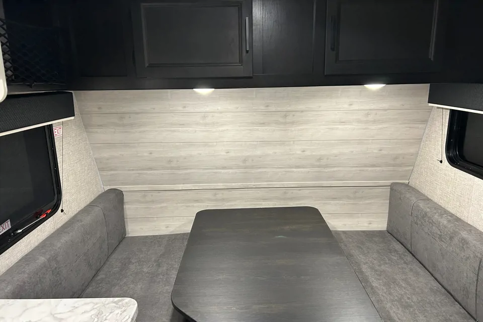 Elle comprend une très grande table à manger qui se convertit en grand lit de 56 x 80 pouces la nuit venue et 2 lits superposés.