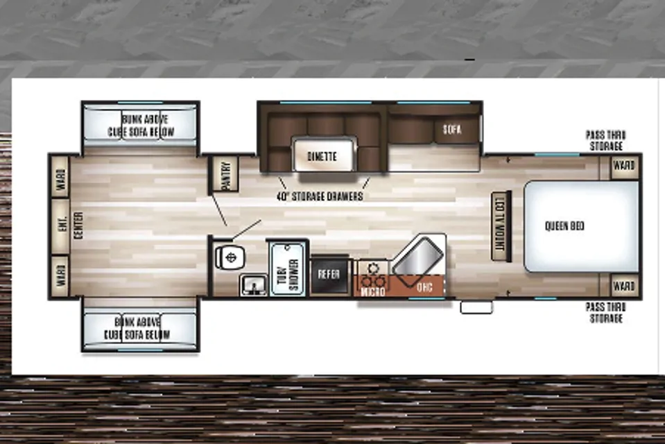 Rear Bunkhouse: The two opposing slide-outs create an open interior space, with cube sofas below and bunks above. Enjoy extra convenience with wardrobes and an entertainment center.
