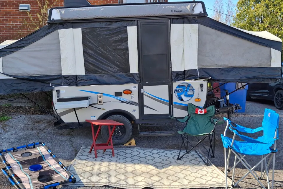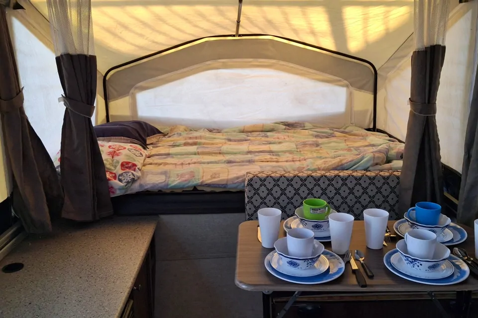 Tente roulotte legere et parfaite pour la petite famille, vient avec tous le nécessaire pour un séjour confortable pour 5 personnes n'apporter que votre literie et vos vêtements. Il y a deux matelas en mousse pour plus de confort et le chauffage pour les nuits plus fraîches.