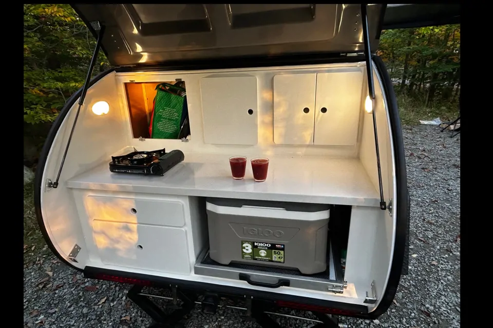 À l’arrière, on y trouve une cuisine extérieure avec rangement. Les accessoires de cuisson, les essentiels de cuisine, un cooler électrique et un brûleur sont fournis.
