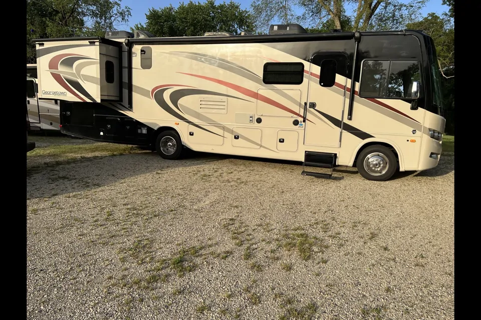 Beautiful, immaculate 35’ Class A Motorhome. Includes L-shaped living room sofa, fireplace and over the driver drop down bunk for storage while camping or a smaller person (or child).