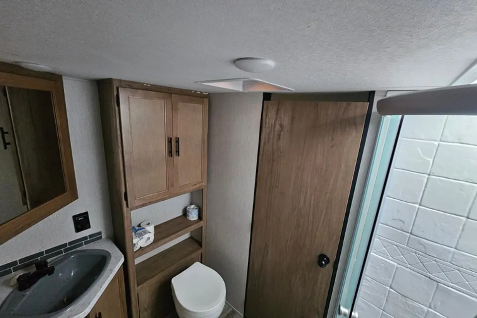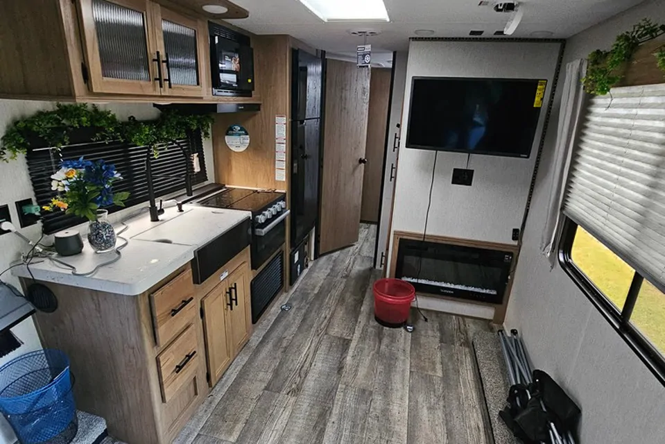 Grey Wolf toy hauler travel trailer. 33 feet. This camper is perfect for the family that loves all around outdoor fun. It features a master bedroom with a separate private entrance and Queen sized bed. It also has a full sized shower in it's complete bathroom with linen closet, a stove, oven, microwave, refrigerator, pantry, bluetooth stereo system and built in fireplace heater. The dining area folds down to create a king sized sleeping area or folds up to create the garage that can accommodate 2 touring sized Harley Davidson motorcycles. Outside features a built in grilling station with mini fridge and Ice maker, as well as shower sprayers on both sides of the camper, tv hook up and pet tie outs. The garage ramp doubles as a patio for additional comfort space. This camper has 2 propane tanks with an auto switch over feature and a blue ox tow hitch setup. Motorcycle tiedown rack system is available with rental. Camper has a 40 gallon fresh water tank and a 38 gallon grey water tank.