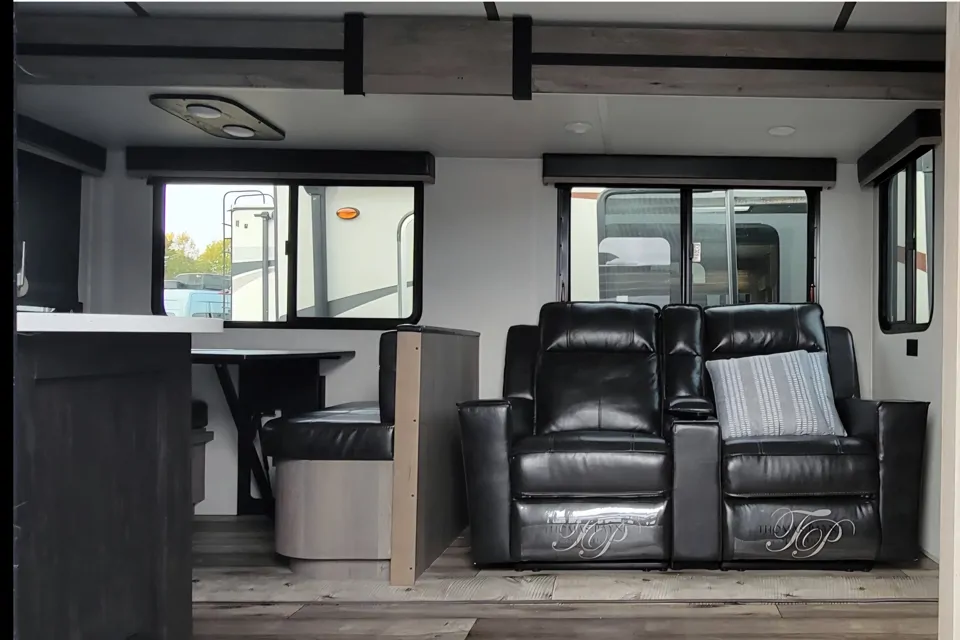 Smart TVs in all rooms, and outdoor kitchen area, Sound system in the living room, fireplace, Bluetooth, 2 Central AC units and Heating, Keyless Entry, 2 Propane tanks, Residential faucet in the kitchen, Coffee maker, EZ leveling kit, Outdoor stove and Mini fridge, Outdoor shower, Dinette converts to a sleeping area, reclining chairs, twin bunk and sofa that converts to bed, power, cable, water and sewer connections.