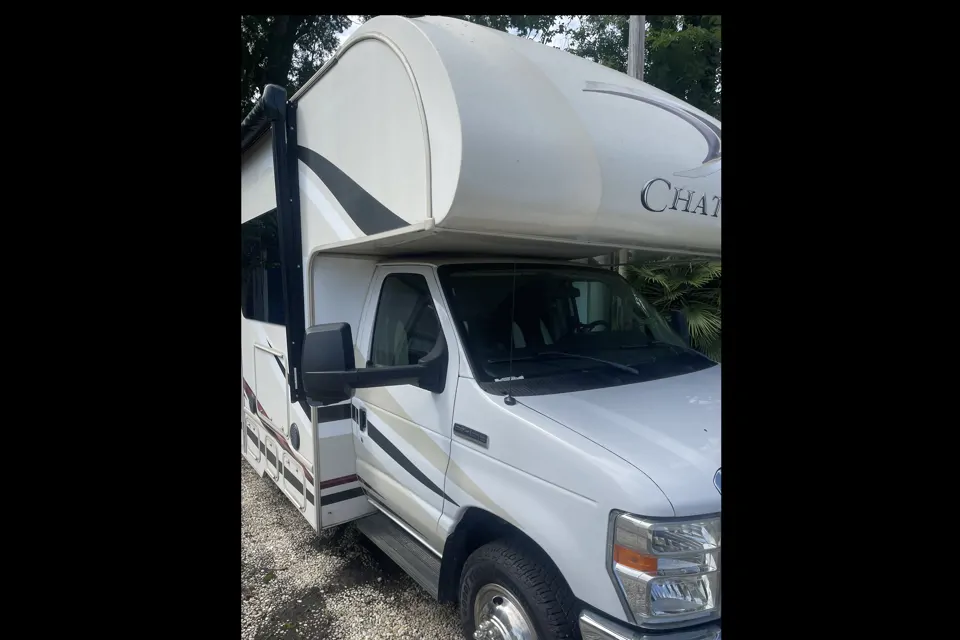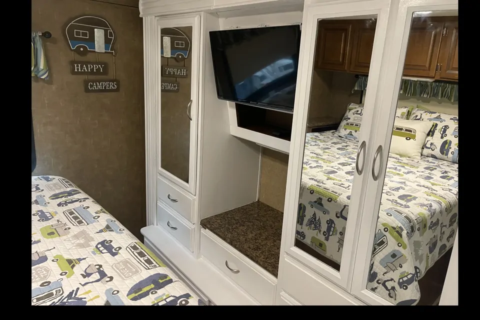 31 foot Class C RV with a super slide, new upholstery, new sofa, new paint, new water-heater, new bathroom counter and new awning and motor. Three TVs (smart tv in living area, one outside), queen-size bed, one fold-out sofa, and dining room table converts to bed. Comfortably sleeps 4 adults or two adults and 4 children. Pet friendly. We have you beach chairs, umbrellas and cooler. No hassle. You just enjoy. We will deliver and set anywhere in the greater Myrtle Beach area!